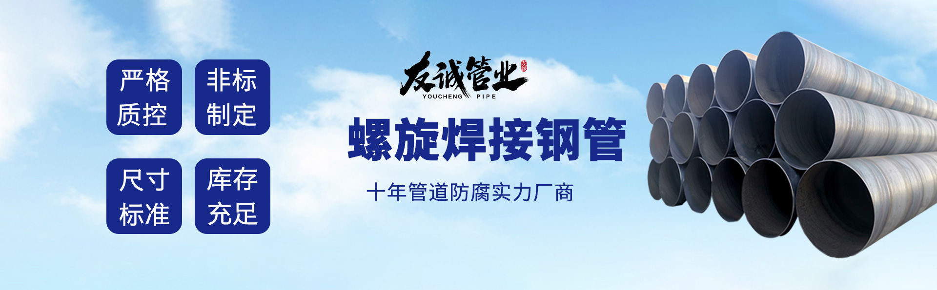 滄州友誠管業有限公司是一家專業從事生產防腐涂塑管道及管件于一體的大型企業。公司注冊資金8600萬元,位于中國管道生產基地—河北鹽山縣,近靠京滬高速、榮烏高速、黃石高速30公里,高鐵滄州西站40公里,天津國際機場、濟南遙墻機場150公里,為客戶來訪及業務發展提供了便利的交通條件。 鋼管系列:螺旋鋼管、無縫鋼管、ERW直縫焊管、JCOE埋弧焊直縫鋼管、熱鍍鋅鋼管。 涂塑系列:內外涂塑鋼管、涂塑復合鋼…… 了解更多